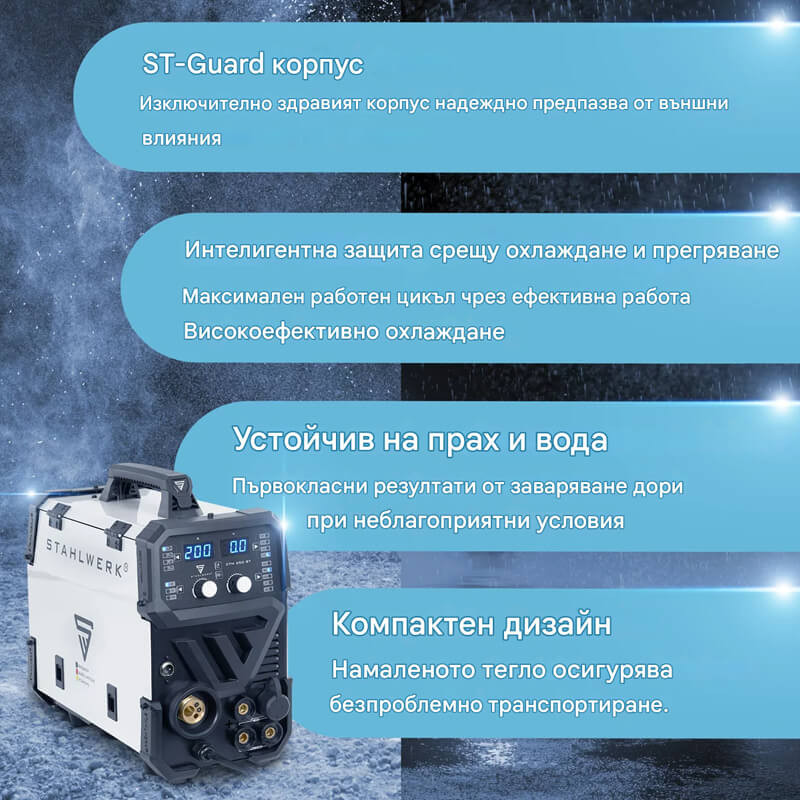 - Ергономичен корпус ST-Guard и интуитивен контролен панел: Здравият корпус ST-Guard надеждно защитава електрониката и е ергономично проектиран. Ясно разположеният контролен панел с цифров дисплей за ток и напрежение, бутон за избор на процес, избор на диаметър на телта, бутони за газ и режим позволява бързо и логично настройване на всички параметри - дори от по-малко опитни потребители.