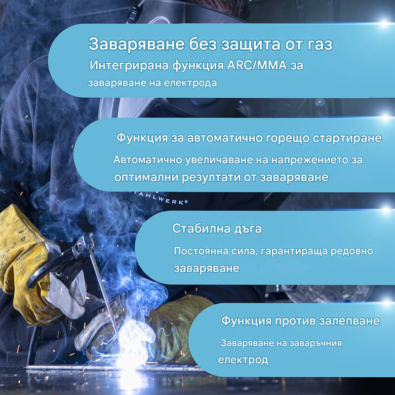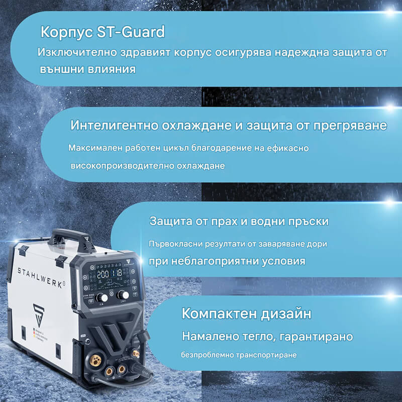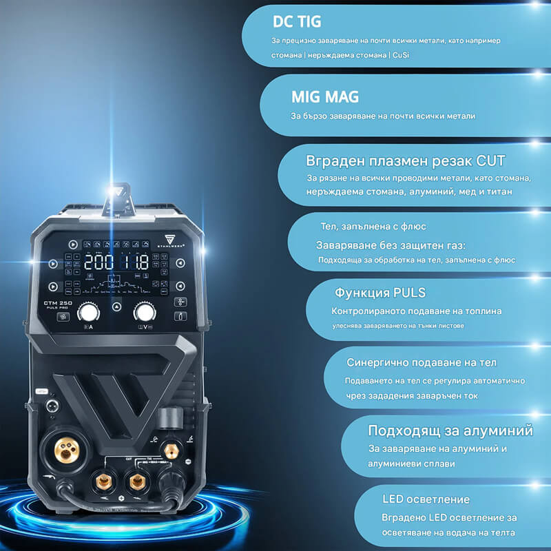 Комбинираният заваръчен апарат STAHLWERK CTM-250 Puls Pro е мощен 6-в-1 инверторен апарат с 200 A, който комбинира TIG, MIG/MAG, MMA и FLUX заваръчни процеси.
