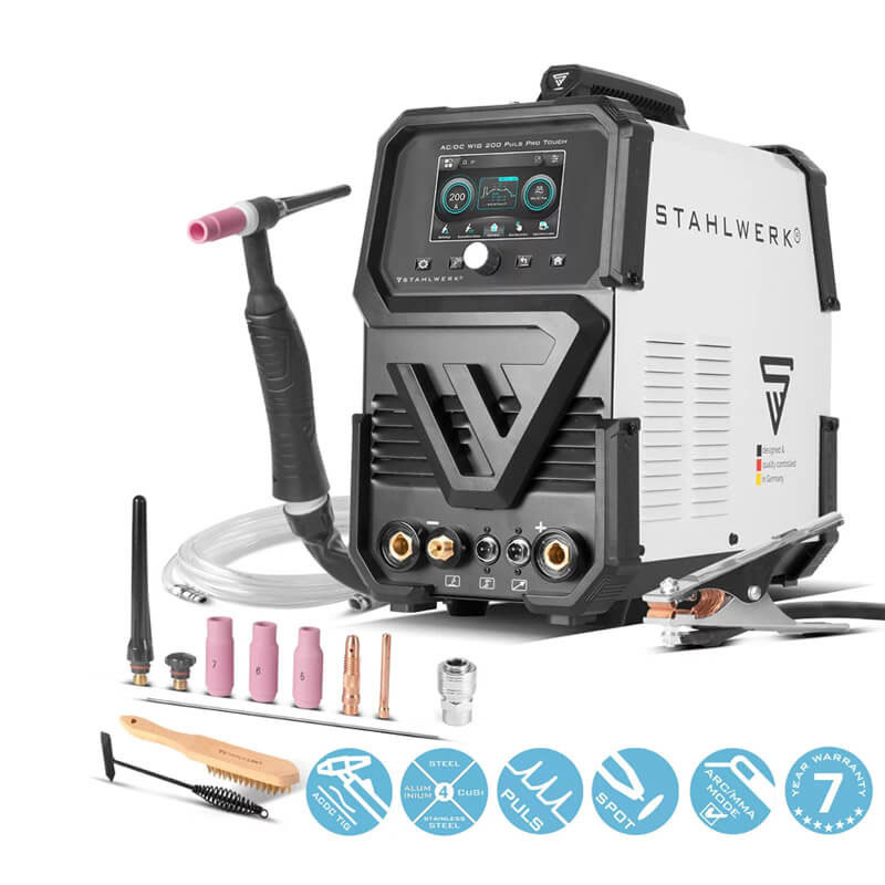 STAHLWERK Заваръчен апарат AC/DC WIG 200 Puls Pro Touch е многофункционален TIG заваръчен апарат с допълнителна MMA/ARC функционалност за заваряване с електроди. Благодарение на усъвършенстваната импулсно-широчинна модулация (PWM) и модерната IGBT технология, този апарат за дъгово заваряване в защитен газ предлага отлични заваръчни характеристики с намалена консумация на енергия. Този мощен заваръчен апарат впечатлява с ниското си тегло и е оборудван с памет за задачи, както и с импулсни и точкови функции. Освен това, апаратът е отличен при заваряване на алуминий и тънки листови метали. Универсалният инверторен заваръчен апарат разполага с цифров сензорен дисплей, който показва обширни функции и удобно позволява голямо разнообразие от настройки за широк спектър от заваръчни процеси, като DC MMA, DC TIG, AC TIG, DC и AC pulse. Различните режими могат да бъдат бързо зададени с помощта на интуитивното меню. Всички зададени параметри на заваряване са лесно видими на ясния цифров дисплей.