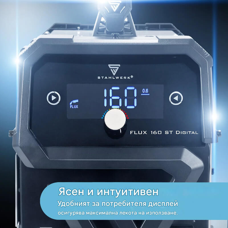 Заваръчният апарат STAHLWERK FLUX 160 ST Digital има синергично подаване на тел, работи с до 160 A и е подходящ за заваряване с флюсова тел FLUX без защитен газ, както и за приложения с Lift TIG и MMA/ARC.