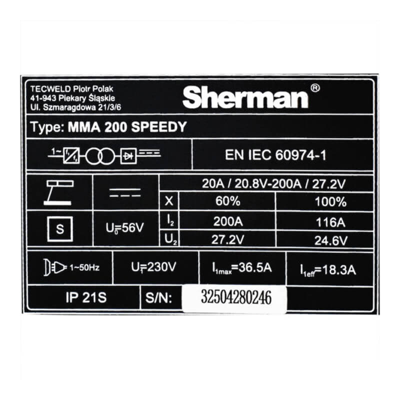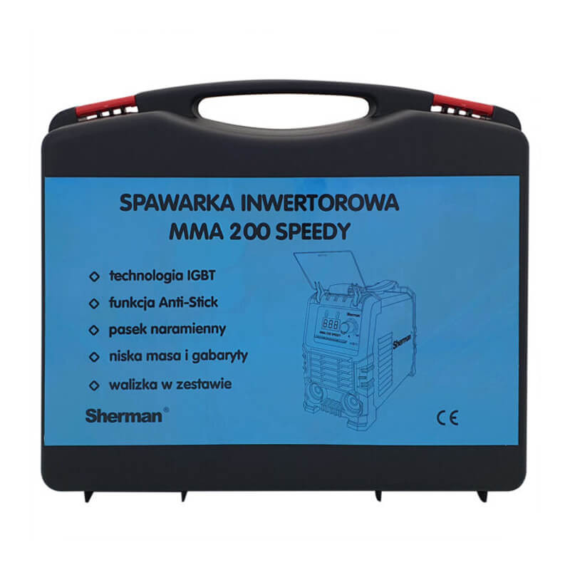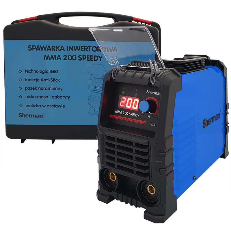 Заваръчният апарат на Sherman MMA 200 Speedy е предназначен за ръчно постояннотоково заваряване на конструкционна стомана с покрити електроди (MMA). Това инверторно устройство е произведено с най-съвременни IGBT компоненти. Заваръчният апарат е оборудван с автоматична функция HOT START за лесно запалване и функция ANTI STICK за лесно отстраняване на електрода в случай на залепване и за предотвратяване на повреда на апарата. Заваръчният апарат е подходящ за закрити или покрити пространства, без да е изложен на пряко атмосферно въздействие. Предназначен е за случайна и любителска работа.