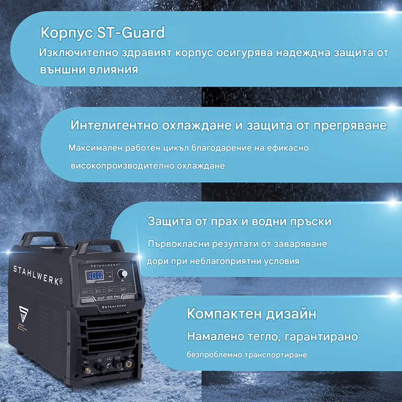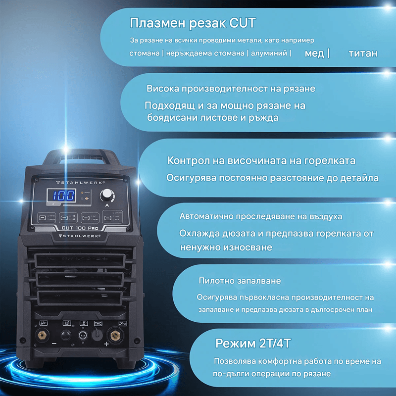 Мощният плазмен резак STAHLWERK CUT 100 Pro с режим 2T/4T осигурява мощни 100 ампера и има прецизно високочестотно (HF) пилотно запалване за първокласно поведение на запалване. В зависимост от материала, капацитетът на рязане е до 44 мм (мека стомана ST37 до 44 мм, V2A или V4A до 32 мм, алуминий до 27 мм). Плазменият резак е подходящ за всички често срещани проводими метали, както и за боядисани листове метал и ръжда. Токът на рязане може да се регулира безстепенно от 30 до 100 ампера. Всички параметри могат лесно да се отчитат на ясно подреден контролен панел. Различните стойности могат да се задават интуитивно и бързо. Компактното устройство има интелигентна защита от охлаждане и прегряване и е лесно за транспортиране с тегло само 28,7 кг. Друга характеристика на плазмения резак е контролът на височината на горелката за използване с CNC контролер. Напрежението на дъгата се измерва чрез 2-пинова THC връзка и се предава към контролера, за да се поддържа постоянна височината на горелката. CUT 100 Pro разполага и с режими на работа "MESH METAL" и "SHEET METAL". Режимът "MESH METAL" е особено подходящ за детайли с решетъчна структура или прекъсвания, където дъгата може да загуби контакт за кратко време. Режимът "SHEET METAL" се препоръчва за непрекъснати листове, където е гарантирано равномерно рязане. Времето за предварителен и последващ въздушен поток може да се настройва индивидуално на устройството. По-дългото време за последващ въздушен поток подобрява охлаждането и по този начин допринася за удължаване на експлоатационния живот на износващите се части. Плазменият резак STAHLWERK CUT 100 Pro се доставя с богат пакет аксесоари.