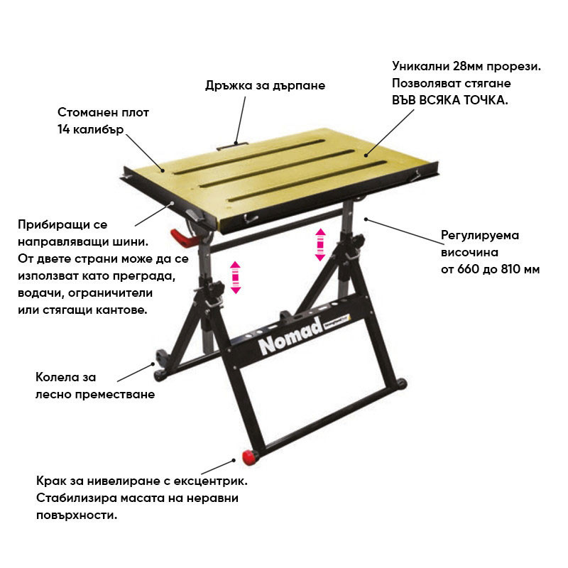 Масата за заваряване Nomad Economy е проектирана да осигури безопасна, преносима, достъпна и гъвкава повърхност за заваряване.